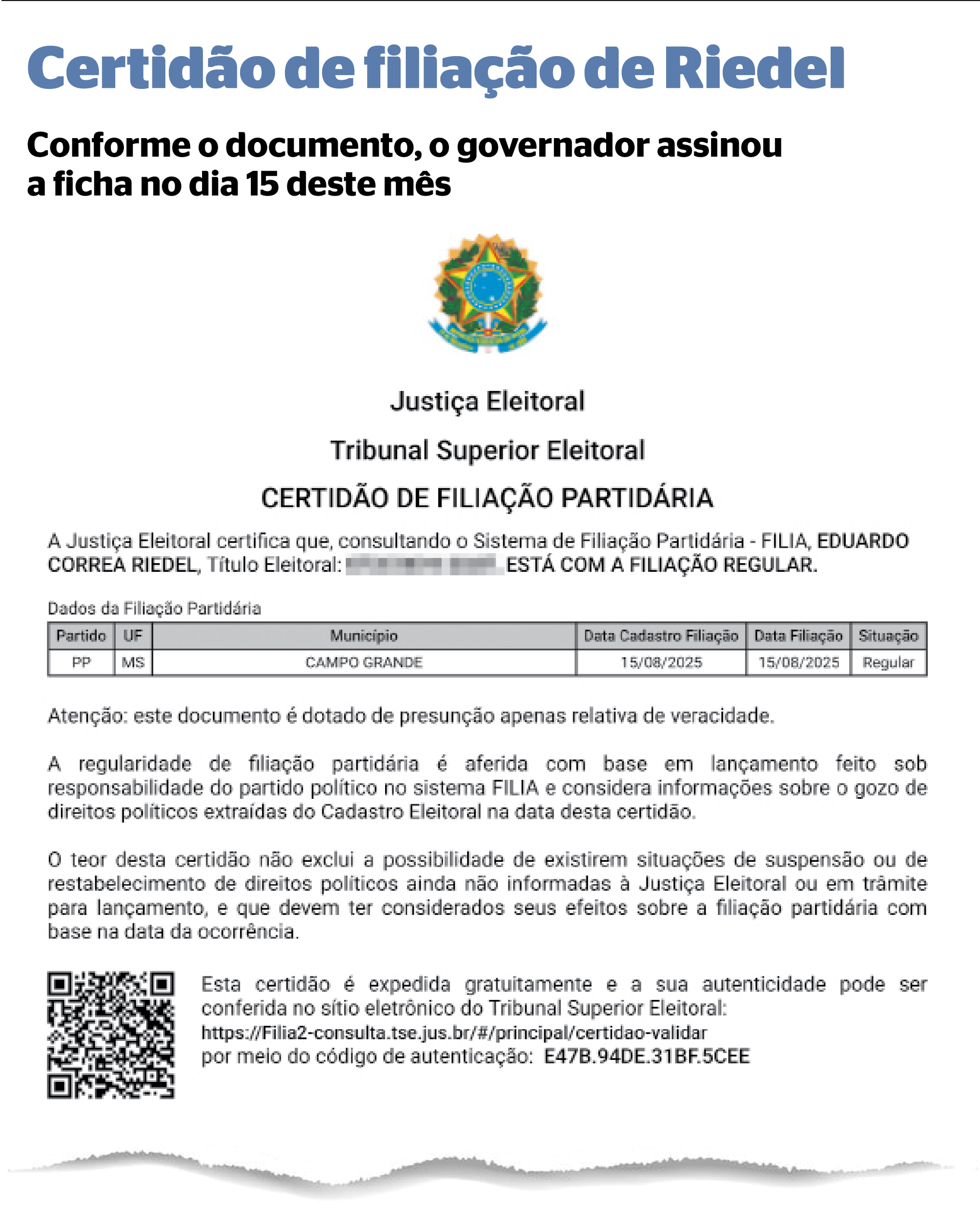 Notícia exclusiva do jornal Correio do Estado aponta que o governador de Mato Grosso do Sul, Eduardo Riedel assinou na sexta-feira (15-08), a ficha de filiação ao PP, conforme consta na sua certidão de filiação partidária, disponibilizada no site do Tribunal Superior Eleitoral (TSE), e hoje vai a Brasília (DF) para participar da convenção nacional do partido, às 8h (horário de Mato Grosso do Sul), no Auditório Petrônio Portela, no Senado, para sacramentar a federação União Progressista, formada pela legenda com o União Brasil.