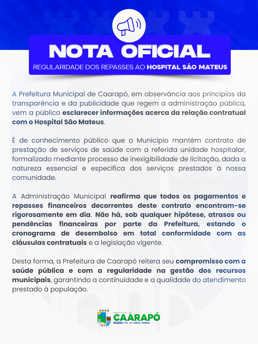 De acordo com o comunicado, a parceria entre o município e a unidade hospitalar foi estabelecida por meio de processo de inexigibilidade de licitação, considerando a natureza essencial dos serviços de saúde ofertados à população.